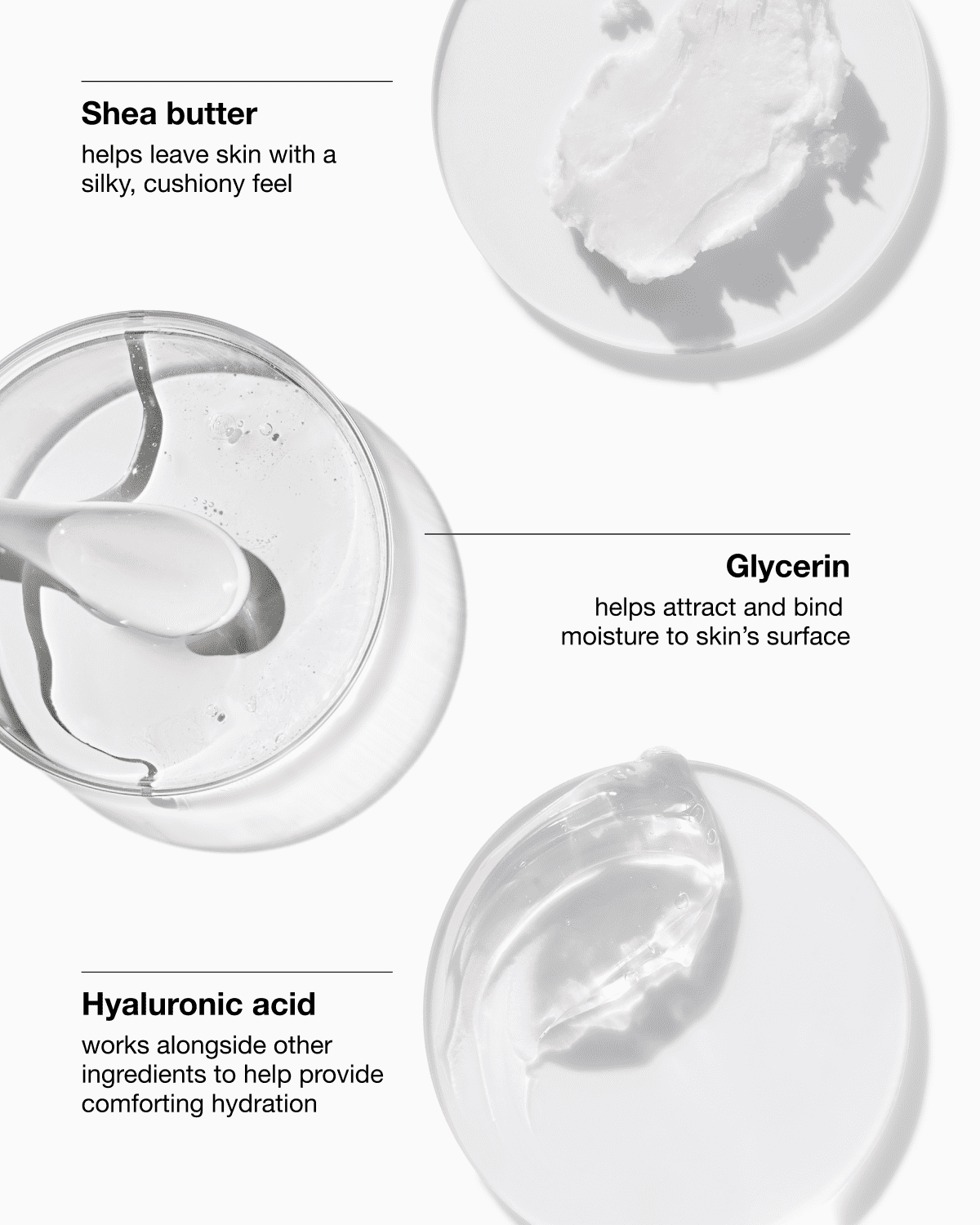 Formulated with shea butter, glycerin, and hyaluronic acid it helps attract and bind moisture to skin’s surface and provide soothing hydration.